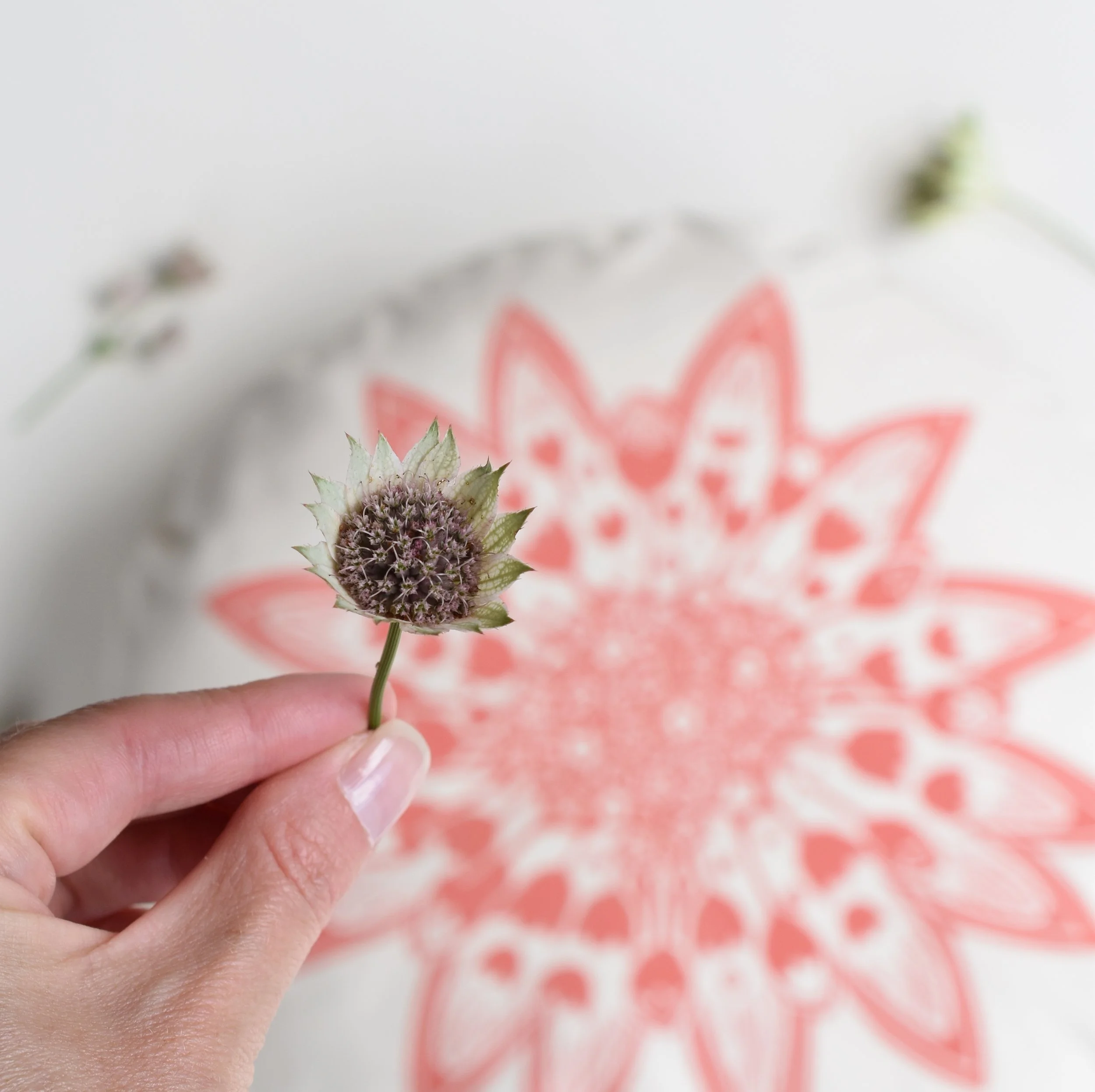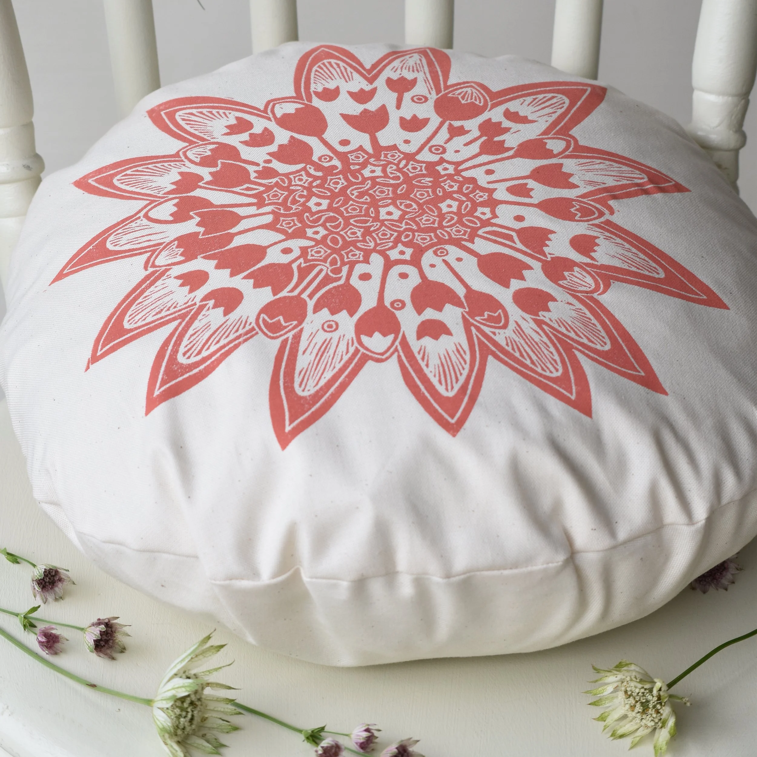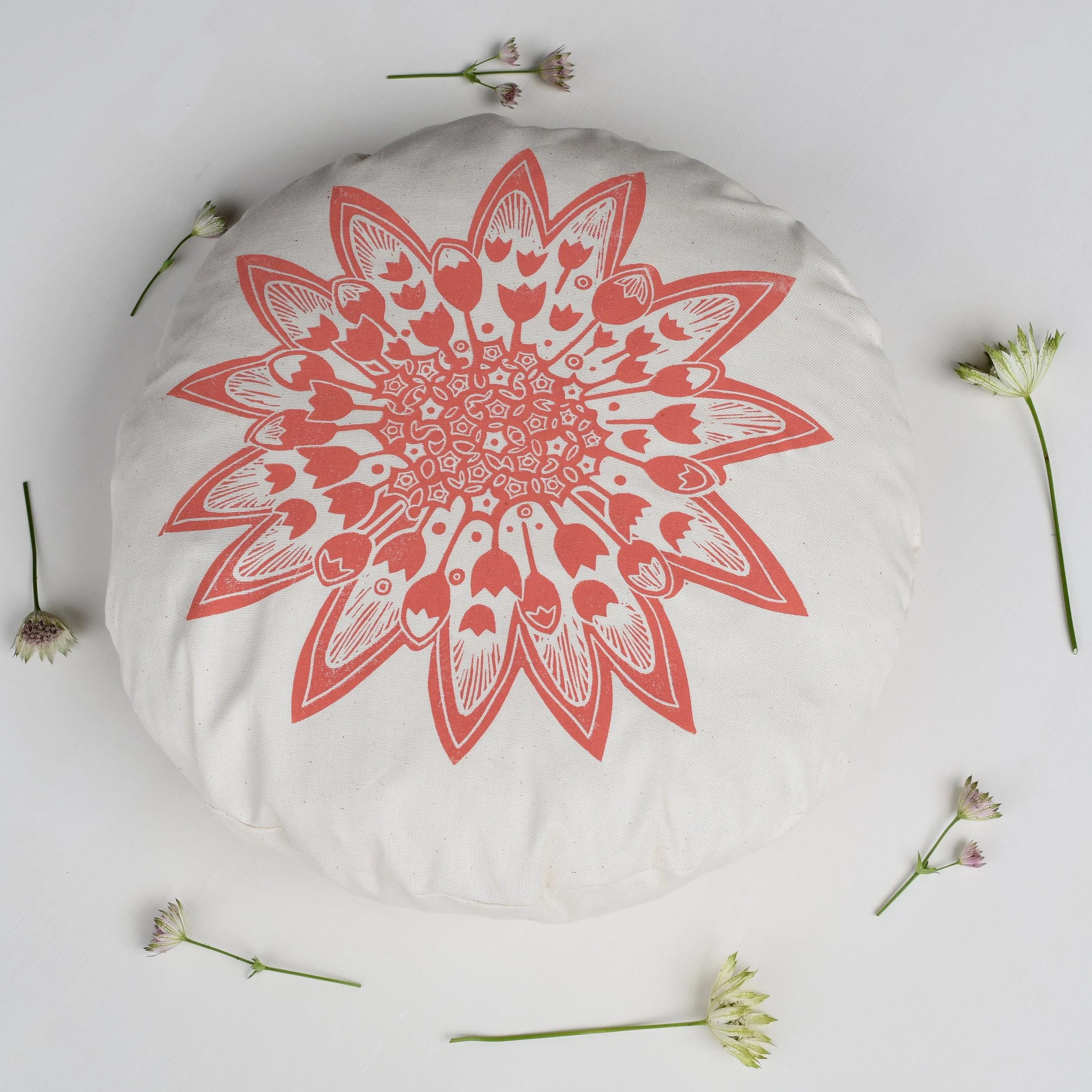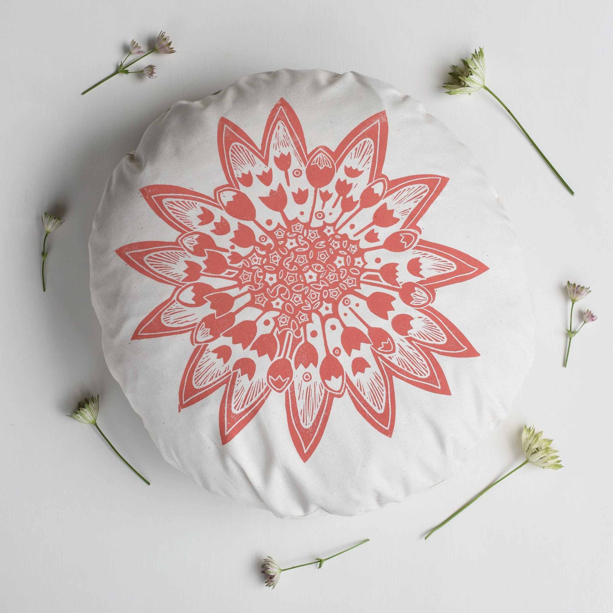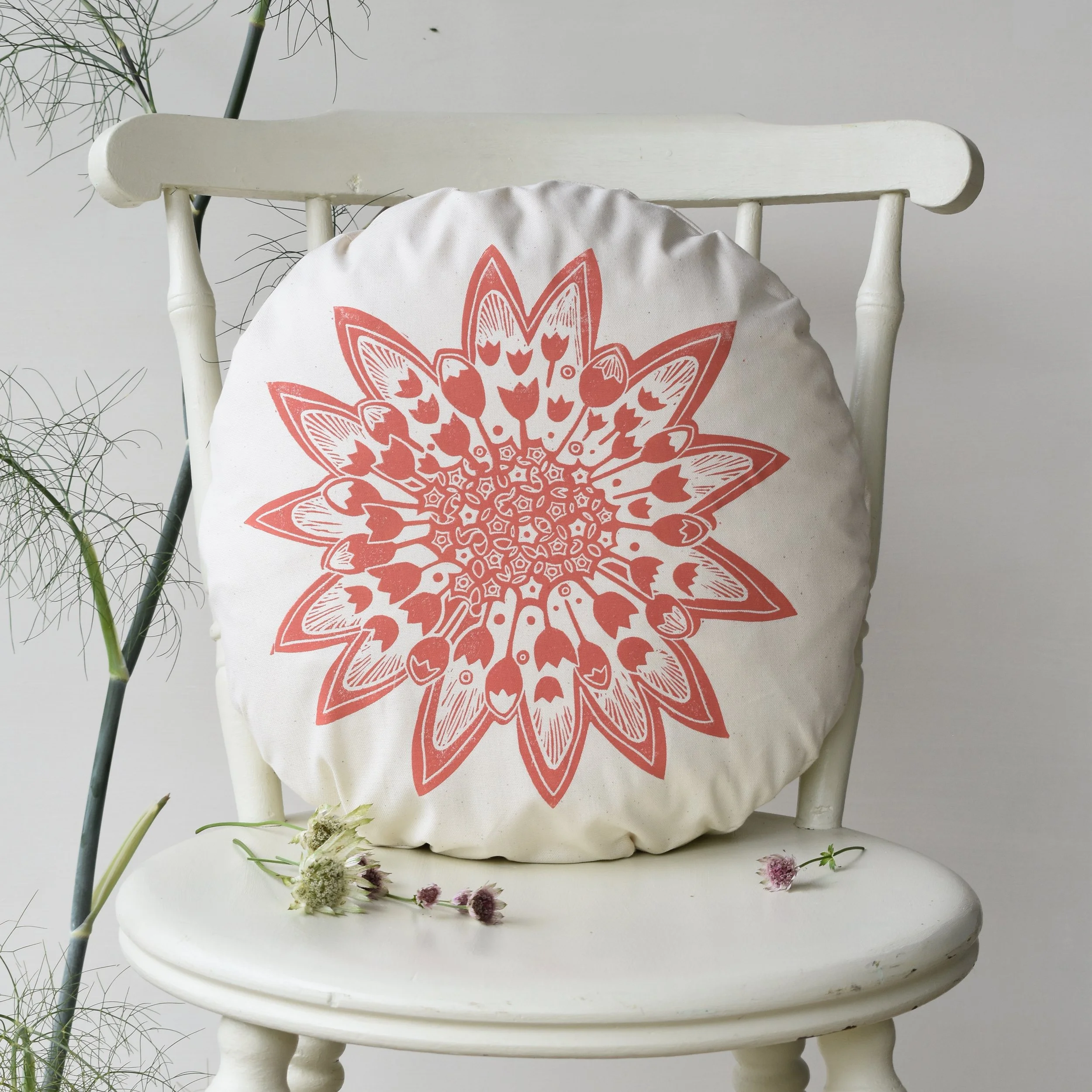 A beautiful + bold round flower head cushion inspired by the Astrantia flower.