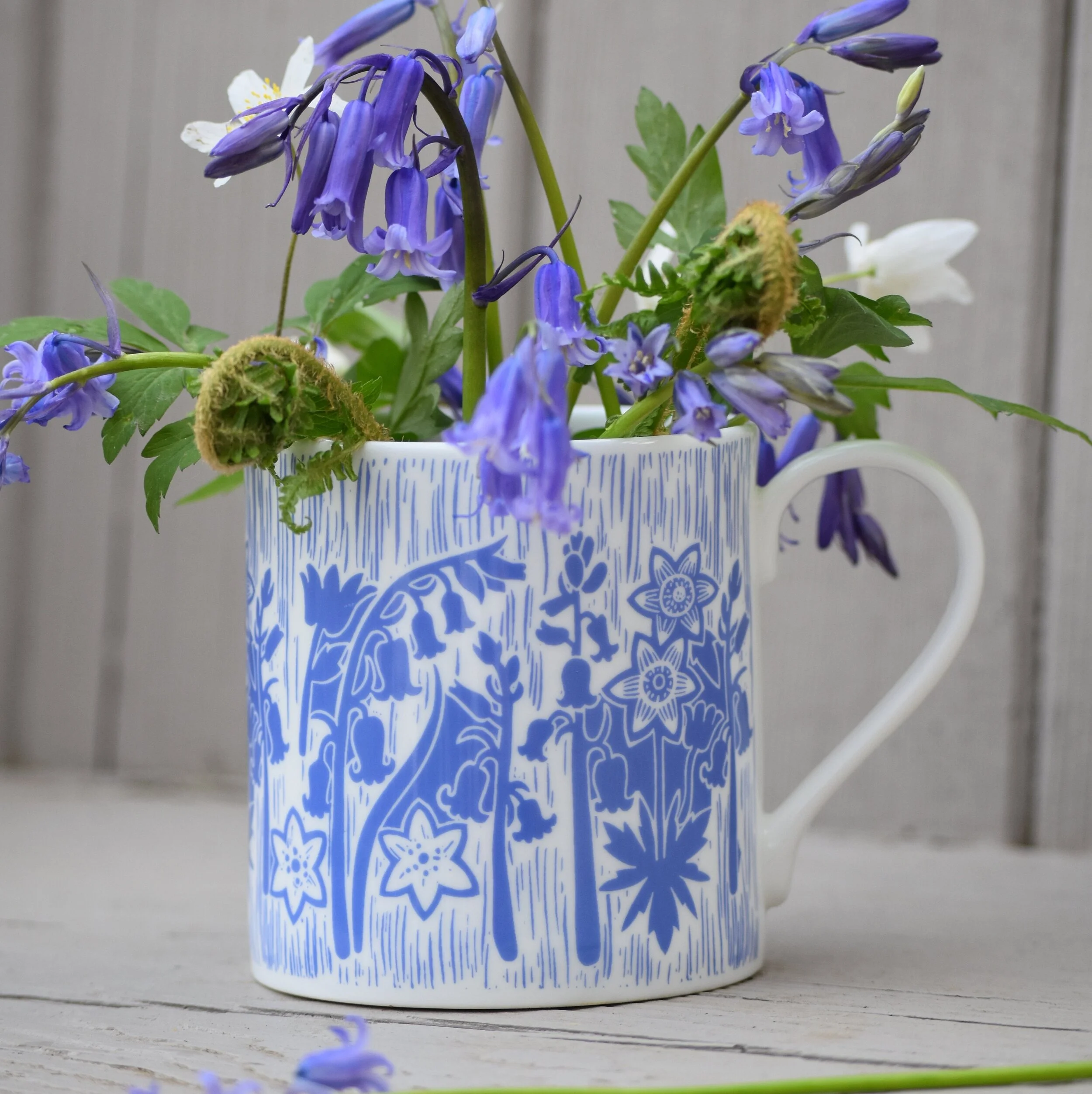 A beautiful British made fine bone china mug inspired by spring flowers - Bluebells + Wood Anemones.